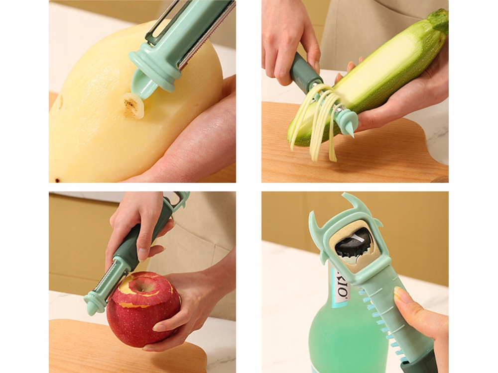 Zařízení kombinuje až 7 praktických funkcí – loupání, krájení na proužky, otevírání lahví, otevírání plechovek, kartáčování zeleniny, odstraňování kůry z citrusových plodů a vyřezávání nečistot. Díky tak širokému použití nahrazuje jeden nástroj několik klasických kuchyňských nástrojů. Díky kompaktní konstrukci je škrabka snadno skladovatelná a ideální jak do domácí kuchyně, tak i na kempování nebo výlety.