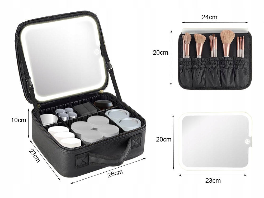 Funkční kufřík na kosmetiku s vestavěným LED zrcátkem je nenahraditelným organizérem pro každou ženu. Ideálně se hodí jak doma, tak na cestách – chrání kosmetiku, pomáhá udržovat pořádek a umožňuje pohodlné líčení za všech podmínek . Kompaktní, ale prostorný, s nastavitelnými přihrádkami a speciální kapsou na štětce – vše, co potřebujete, na jednom místě.