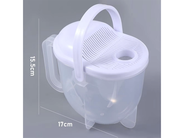 A functional container with a built-in strainer, ideal for rinsing rice, porridge, vegetables or fruit.