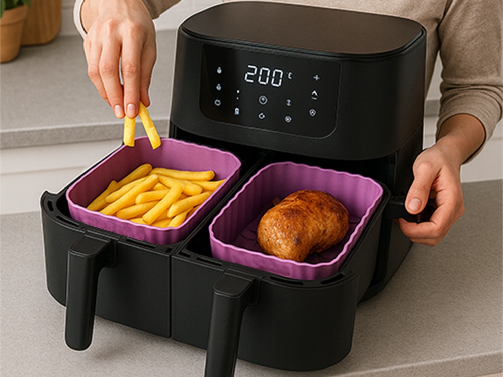If you care about convenience in everyday cooking, soft silicone is exactly what you need. Thanks to its flexibility, the container not only makes it easier to remove food, but also adapts to different models of deep fryers, giving you more freedom. You can store it easily because it does not take up much space and does not deform during use. Silicone does not emit odours or react with food, which increases comfort and safety of use. It is a solution that not only makes your work easier, but also improves the quality of your meals.