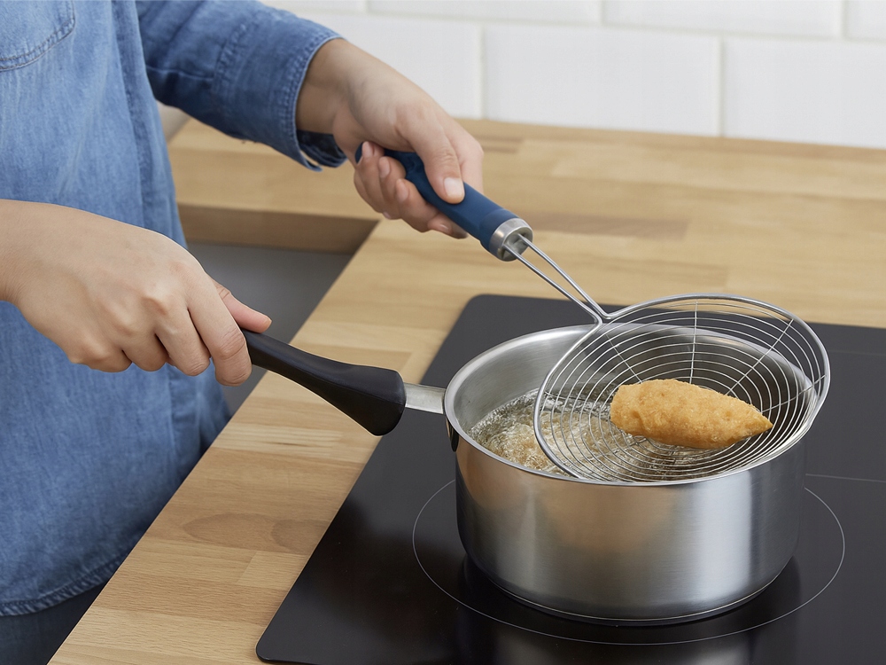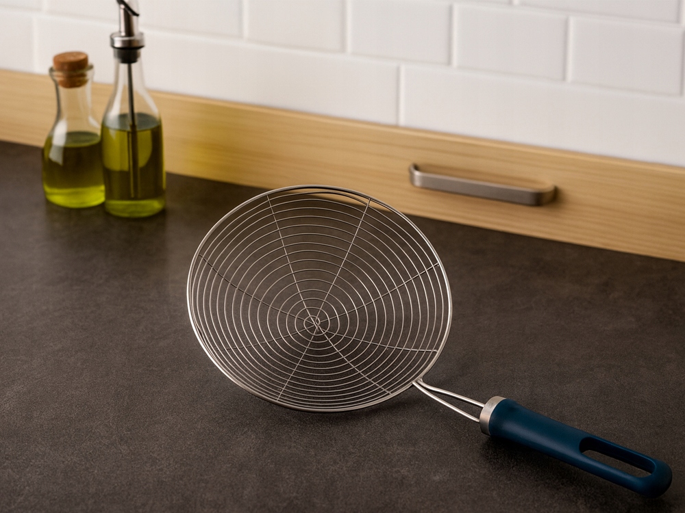 The spoon is made of durable stainless steel, which is resistant to high temperatures and easy to clean. The dense wire spiral ensures effective draining, and the ergonomic handle guarantees stability and a comfortable grip. The combination of solid construction and thoughtful design makes the tool reliable and durable during intensive use.