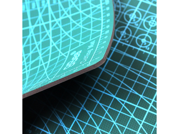 Le tapis de découpe auto-cicatrisant est composé d'un matériau spécial qui se referme partiellement après avoir été incisé par une lame. Il reste lisse après la découpe. Il comporte une couche sur les deux faces sur laquelle sont imprimés verticalement et horizontalement la graduation en centimètres, les angles, les rapporteurs, les lignes parallèles et les figures.