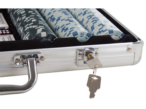 Professzionális, masszívan elkészített póker vagy kocka készlet. Két pakli kártyával, egy kockakészlettel és 300 játékzsetonnal , elegáns tokba csomagolva. Tartalmazza a pókerjátékhoz szükséges összes elemet.