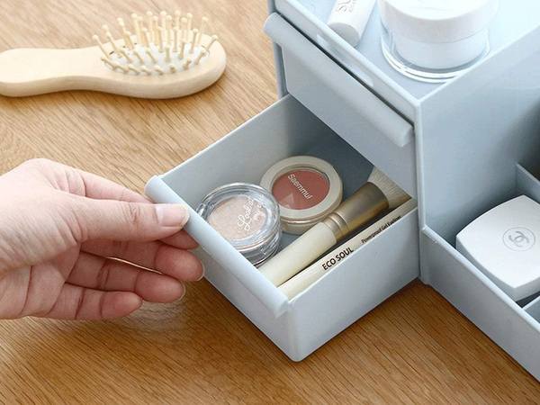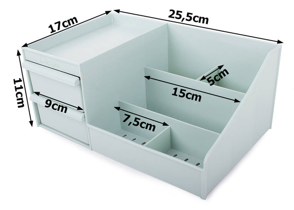 A szervező 2 fiókkal rendelkezik, amelyekben például rúzsok, szemfestékek és egyéb lapos tárgyak tárolhatók.