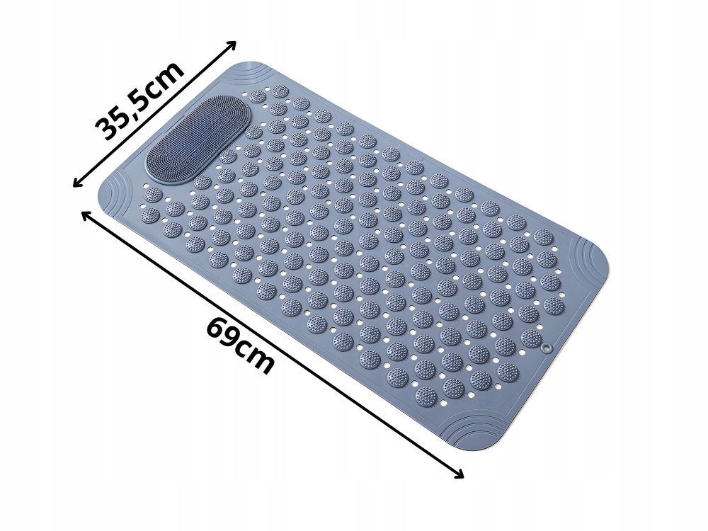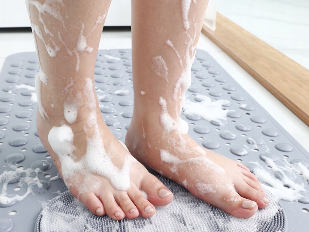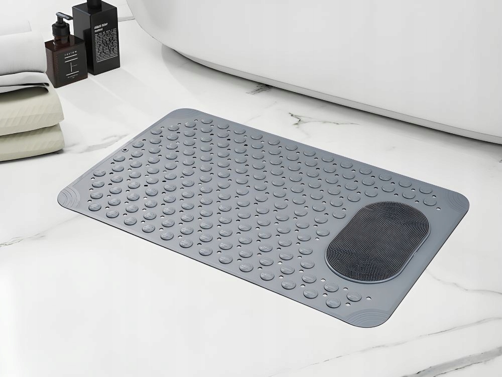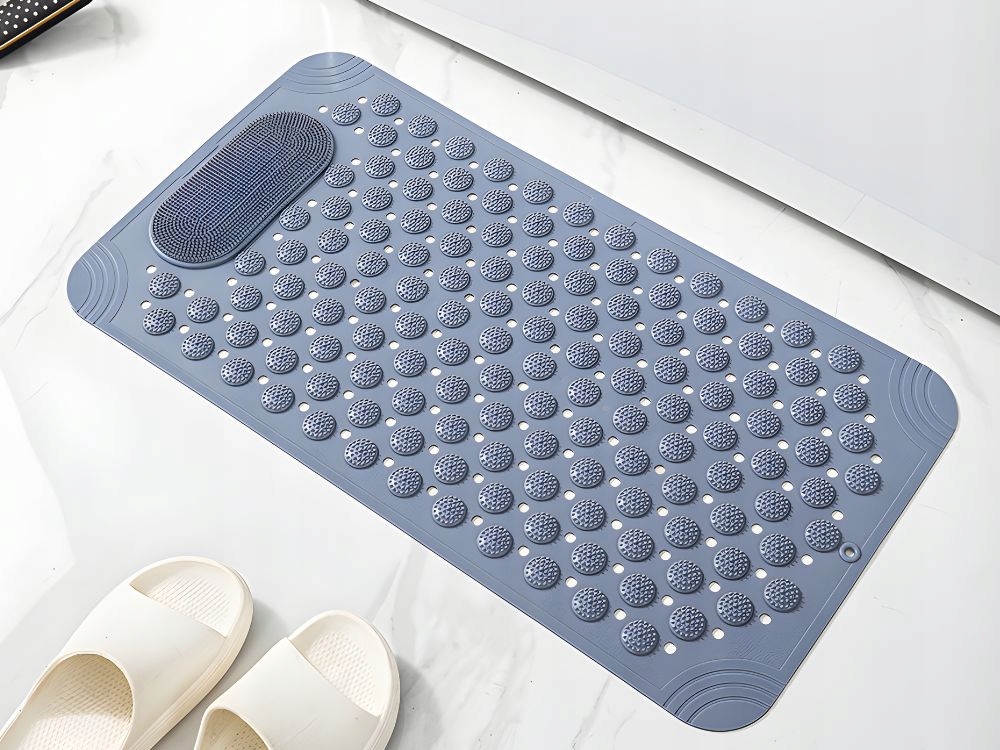 Iškilimai visame kilimėlio paviršiuje švelniai masažuoja kojas stovint, didindami komfortą. Papildoma zona su smulkiomis šeriukėmis leidžia lengvai nuplauti kojas be reikalo lenktis – tiesiog pridėkite muilo ar gelio.