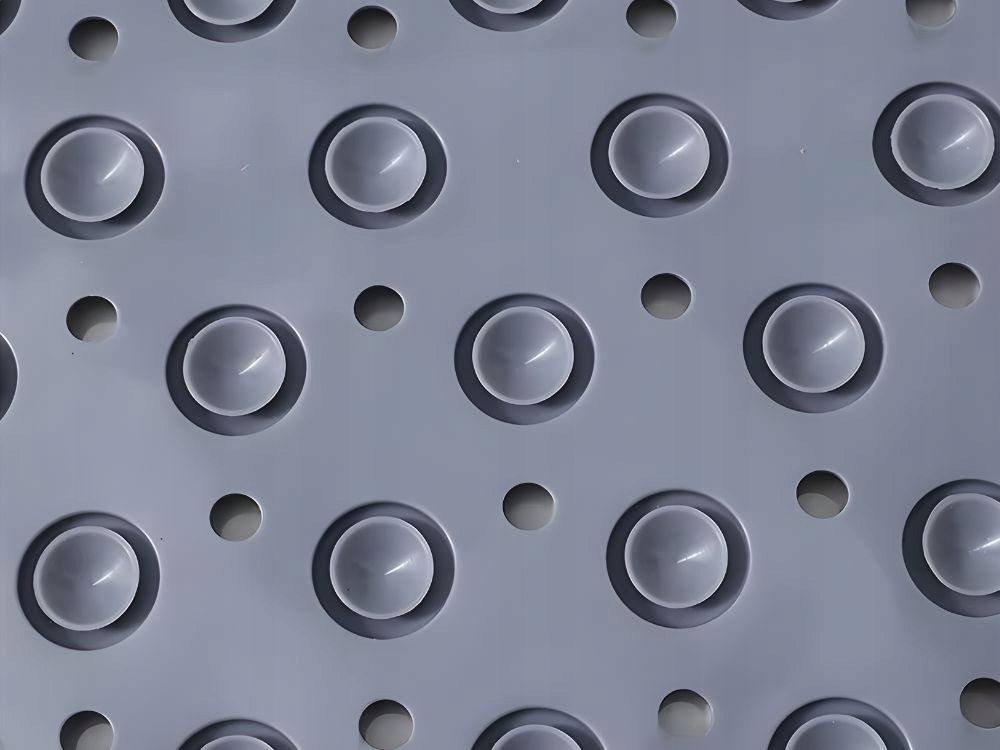 Kilimėlio apačioje yra daugybė siurbtukų, kurie tvirtai prilimpa prie grindų ir neleidžia paslysti. Drenažo angos leidžia greitai nutekėti vandeniui, todėl paviršius nesulaiko drėgmės ir išlieka higieniškas.