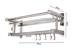 Wisząca, elegancka półka do łazienki w kolorze srebrnym. Półka posiada pojemną półkę na kosmetyki oraz dwa relingi na ręczniki. Na jednym z relingów znajdują się cztery wieszaki.