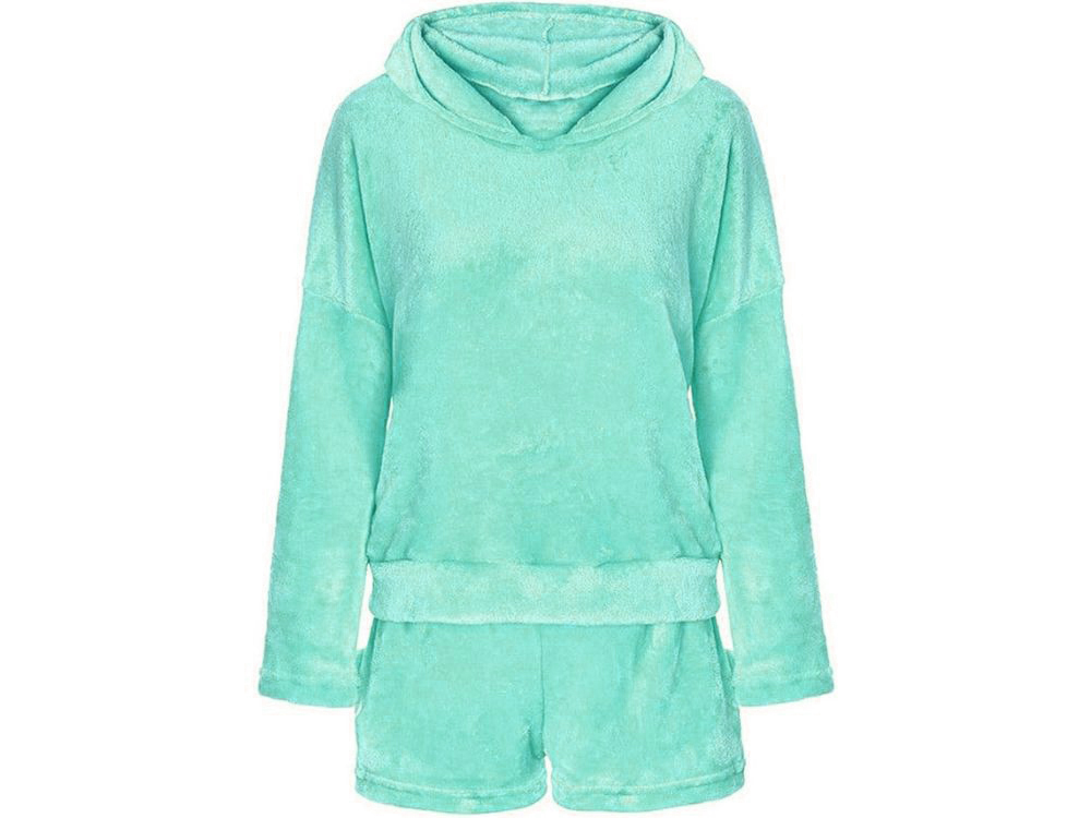 CIEPŁA PIŻAMA DAMSKA DWUCZĘŚCIOWA Z KAPTUREM MIĘKKA PLUSZOWA KRÓTKIE L