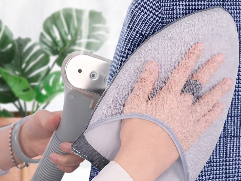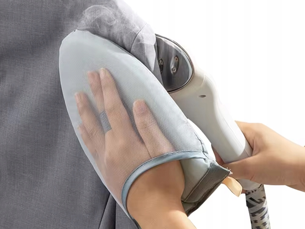 Ergonomiczny kształt oraz elastyczny pasek na dłoń sprawiają, że rękawica stabilnie leży na ręce i nie przesuwa się podczas użytkowania. Dzięki temu można prasować trudno dostępne miejsca, takie jak rękawy, kołnierze, ramiona czy plisy – szybko i dokładnie.