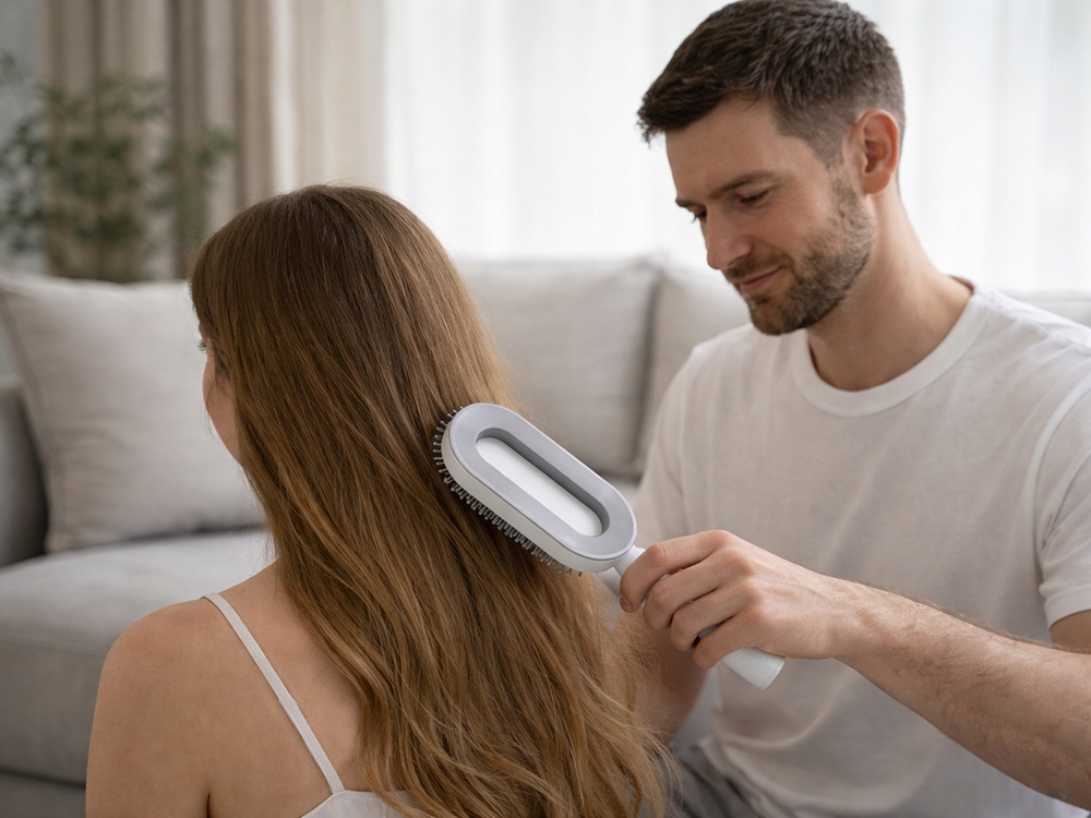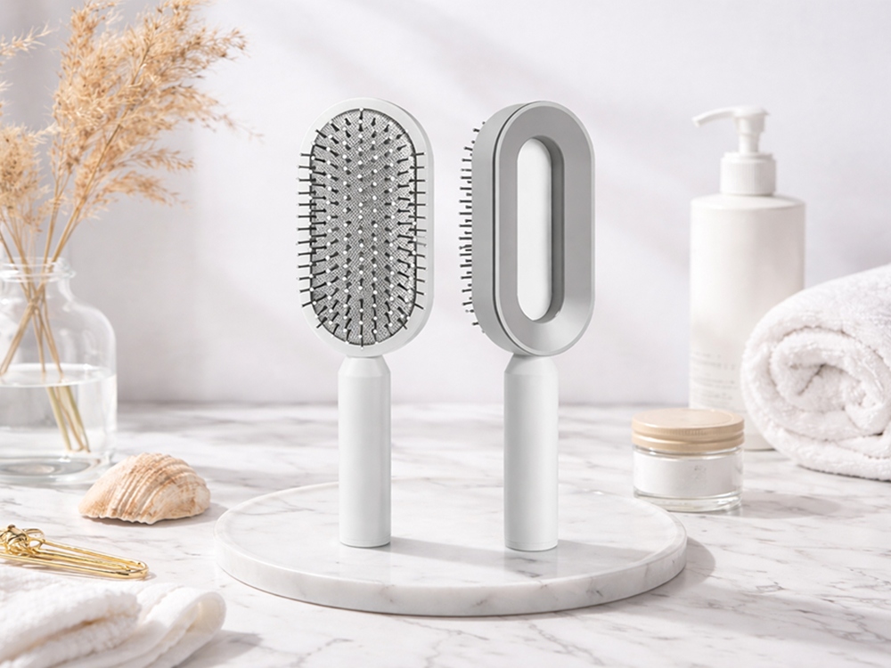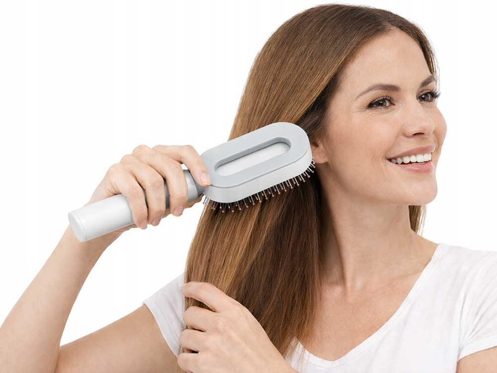 Szczotka posiada ergonomiczny uchwyt i nowoczesną, zamkniętą konstrukcję z otworem w środku – łatwą do trzymania, higieniczną i odporną na zabrudzenia. Wykonana z trwałego tworzywa ABS i nylonu, nie łamie włosów i nie elektryzuje ich podczas czesania, co czyni ją idealną dla osób z problemem puszenia się i elektryzowania włosów. To świetny wybór do codziennego użytku, jak i do zabrania w podróż.