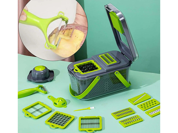 Náš krájač je skutočným centrom všestrannosti vo vašej kuchyni. Vďaka 13 rôznym krájacím vložkám môžete ľahko a rýchlo pripraviť zeleninu, ovocie, syr a dokonca aj mäso akýmkoľvek spôsobom. V súprave nájdete náplne s rôznou hrúbkou, ktoré vám umožnia získať tenké plátky alebo jemné kocky.