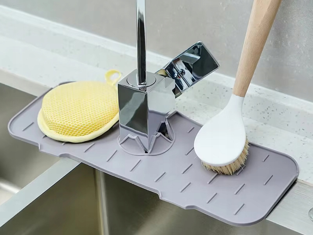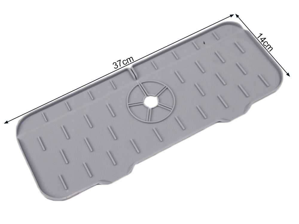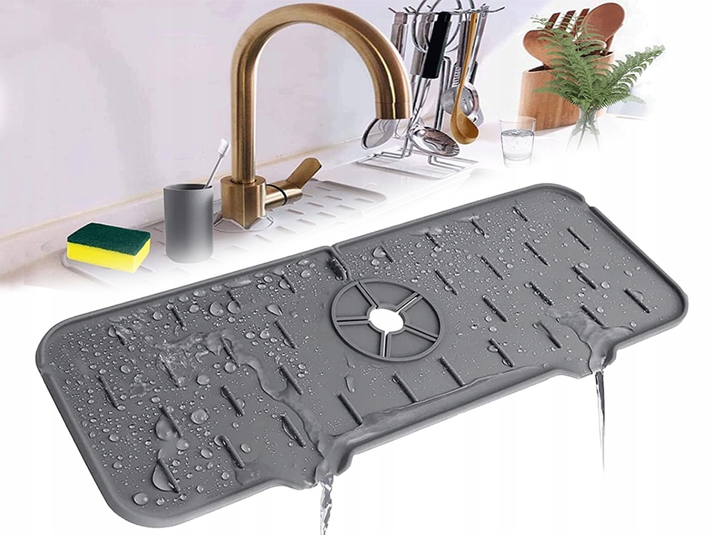 Silikónová podložka pod drez je praktický kuchynský doplnok, ktorý chráni pracovnú dosku pred vodou a vlhkosťou, ktorá sa hromadí okolo vodovodného kohútika. Vďaka univerzálnemu otvoru sa hodí na väčšinu štandardných vodovodných batérií s priemerom do 60 mm a flexibilný materiál umožňuje perfektné prispôsobenie. Poskytuje nielen ochranu, ale aj pohodlné miesto na odkladanie špongií, kefiek a iného kuchynského príslušenstva.