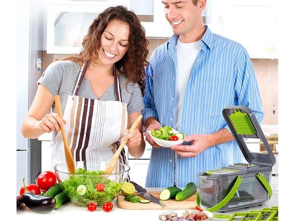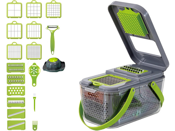 Večnamenski rezalnik je popoln pripomoček za vsako kuhinjo. Z njo lahko preprosto narežete, sesekljate in naribate različne sestavine za vaše najljubše jedi. Zaradi neverjetne raznolikosti 13 različnih rezalnikov lahko debelino in obliko reza prilagodite svojim željam, poleg tega pa sta priložena še cedilo za jajčni rumenjak in lupilec zelenjave. Začnite uživati v udobju in natančnosti v kuhinji še danes!