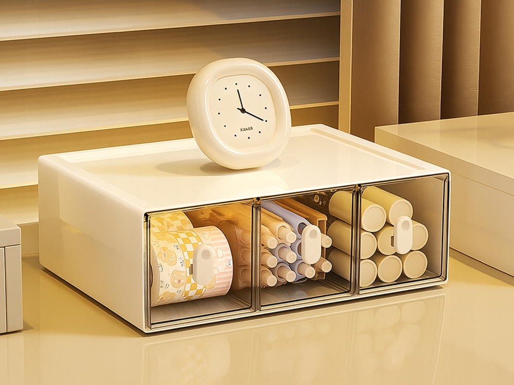 Tavečnamenski organizator s tremi predali je kot nalašč za vsak prostor, kjer sta pomembna urejenost in red. Idealno za kuhinjo, kopalnico, otroško sobo ali pisalno mizo – prilega se v vsak interier. Njegov eleganten videz, kompaktna velikost in funkcionalna zasnova se združujejo in spreminjajo način, kako organizirate svoje vsakdanje predmete. S tem izdelkom ima vse svoje mesto.