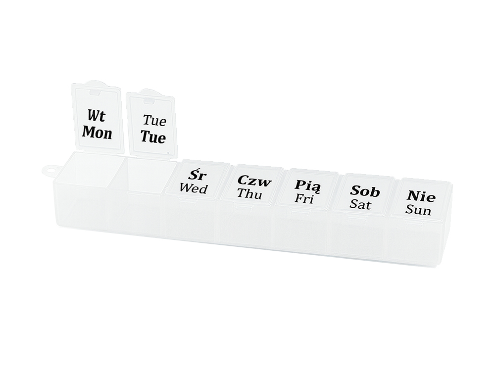 El contenedor semanal para medicamentos es un conjunto de siete cajitas de plástico contenidas en un estuche colectivo. Es la solución ideal para preparar los medicamentos para toda la semana, especialmente para personas con enfermedades crónicas.