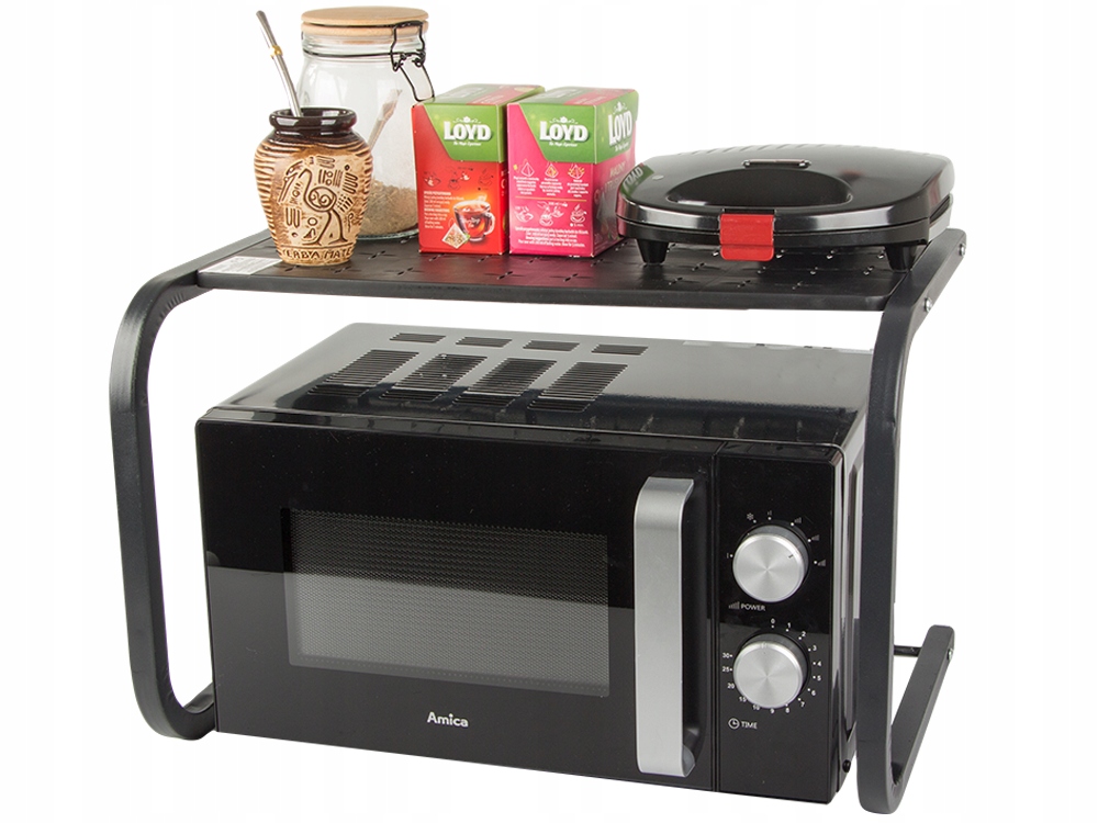 El soporte para microondas es una solución práctica que permite ahorrar espacio en la cocina y organizar mejor el espacio de la encimera. Su diseño permite colocar el microondas en el nivel inferior, mientras que el estante superior es ideal para guardar pequeños electrodomésticos, accesorios de cocina, especias o vajilla.