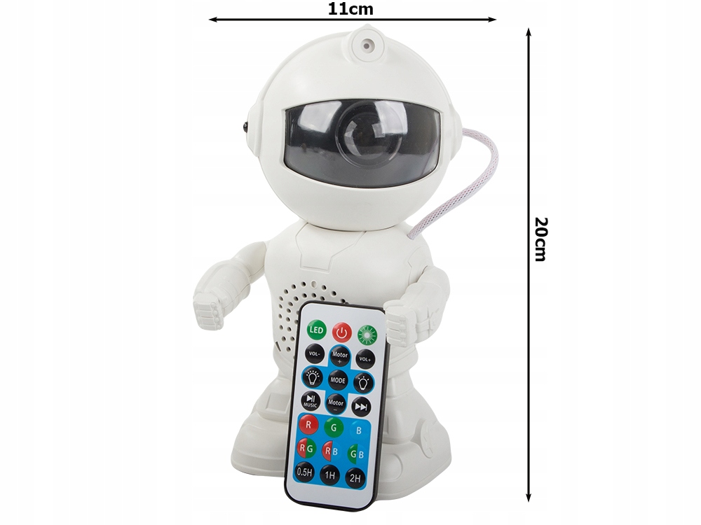 El proyector destaca por su aspecto original: la forma de un astronauta de pie con los brazos móviles llama la atención y añade encanto a cualquier interior. La figura está fabricada en plástico resistente, con gran atención al detalle. En el casco se esconde la lente principal, que gira y proyecta la luz en el techo o las paredes.En la parte superior del casco hay dos luces que funcionan como proyectores laterales (puntos de luz láser fijos). Es una elección perfecta tanto para niños como para adultos, ideal como regalo para cualquier ocasión.
