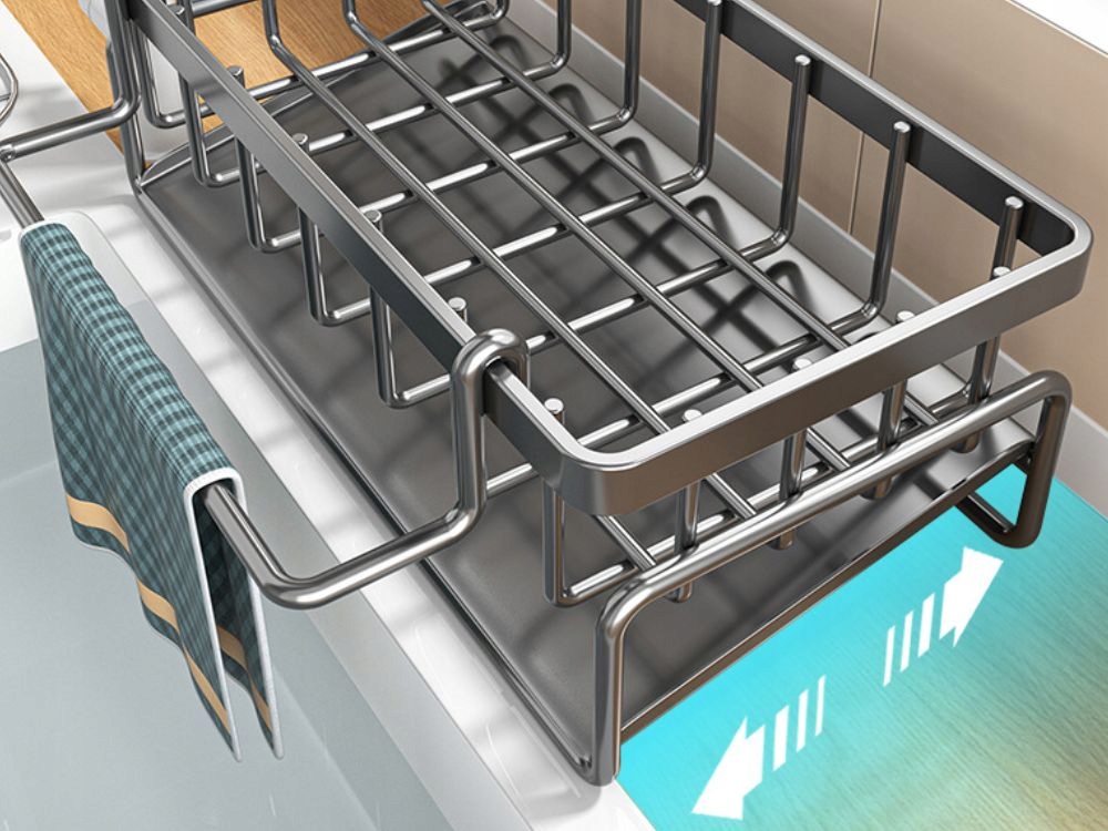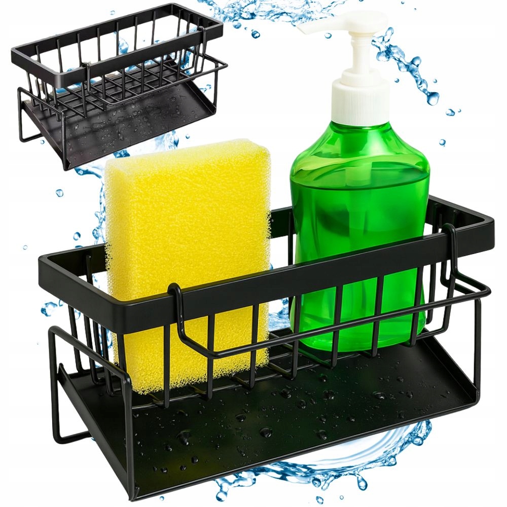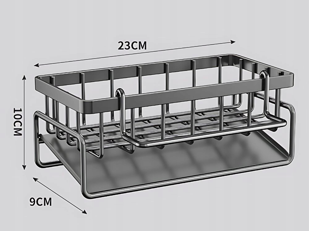 El organizador está fabricado en metal resistente con recubrimiento en polvo, lo que garantiza su resistencia a la humedad y al óxido. Está equipado con una bandeja especial que recoge el agua que gotea de las esponjas o botellas, evitando la formación de manchas y manteniendo la encimera limpia.