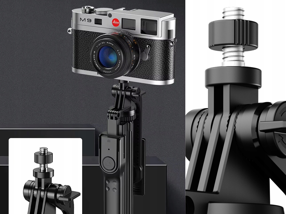 El dispositivo está equipado con un soporte para teléfono giratorio de 360°, lo que permite grabar sin problemas en vertical y en horizontal. Además, el palo tiene una rosca estándar de 1/4 de pulgada, lo que permite acoplar una cámara fotográfica, una cámara deportiva u otros accesorios. El soporte lateral permite girar el dispositivo con precisión en horizontal, lo que resulta muy útil para grabar vídeos y realizar transmisiones en línea.