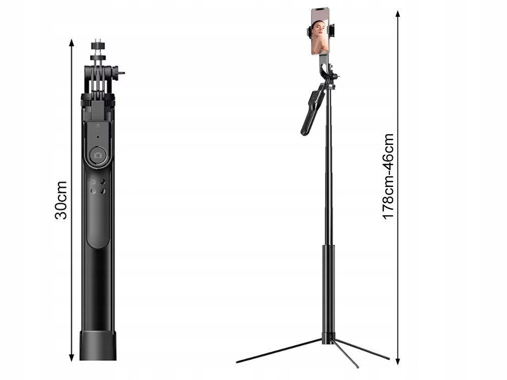 El palo para selfies con función de trípode es un accesorio versátil que resulta ideal tanto para viajar como para grabar en casa o al aire libre. Gracias a su sólida estructura de aluminio, el palo es ligero, pero a la vez resistente y estable. Una vez plegado , mide solo 30 cm, lo que facilita su transporte, y una vez desplegado alcanza una longitud de hasta 178 cm, lo que permite capturar encuadres perfectos desde una perspectiva amplia.